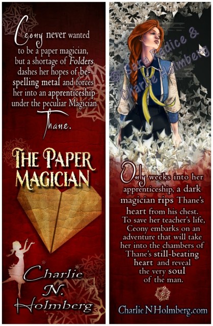 Because The Paper Magician is my debut novel, I had never actually designed a bookmark before. That, and I’m not a designer, so I relied heavily on my friend Sara’s skills. (Sara has also done many a commission for me. She’s excellent.) For the bookmark, we decided to include a picture of Ceony, my protagonist. I sent Sara a description of what Ceony looked like, along with a few references pictures, and then got to work on the text.